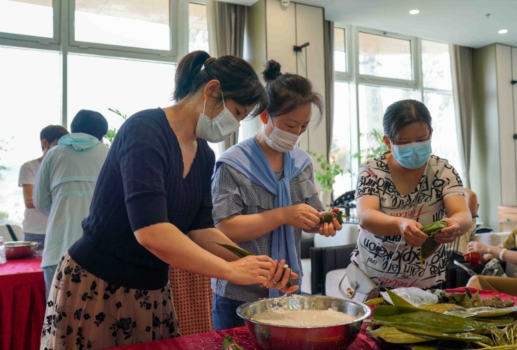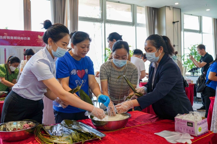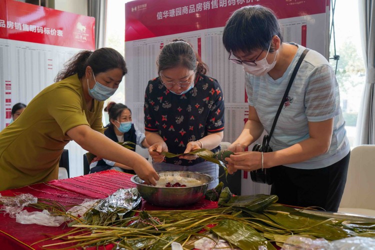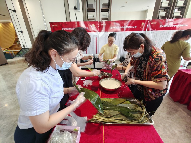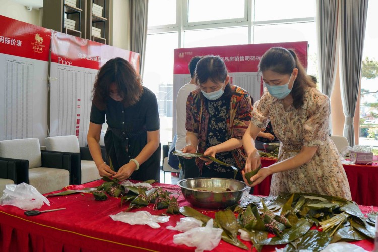 活動當天,信華城營銷大廳粽葉飄香,一片歡聲笑語。活動現(xiàn)場準備的糯米、粽葉、紅棗、棉線、剪刀等材料整齊地擺在六組參賽隊伍中,女職工們熱情高漲、躍躍欲試。此次活動了邀請公司技能熟練的女職工進行現(xiàn)場教學(xué),手把手教授包粽子技巧,大家學(xué)的認真而專注,都想在比賽中一展身手。比賽環(huán)節(jié),隨著裁判一聲令下——“比賽開始”,大家紛紛拿出看家本領(lǐng),爭先恐后的拿粽葉、填糯米、加紅棗、裹粽葉、綁粽子,眼疾手快、動作靈活,一會功夫一個個精致飽滿、形態(tài)各異的粽子很快裝滿了餐盤,比賽結(jié)束并分別評出一、二、三等獎。整個活動現(xiàn)場熱鬧非凡,氛圍歡快而緊張,溫馨而祥和。為使奮戰(zhàn)在開發(fā)建設(shè)一線的同志們盡快吃上熱乎乎的粽子,為項目一線同志加油鼓勁送溫暖,公司40余名女同志齊心協(xié)力、加班加點共計包制了近一千一百余個飽含心意的粽子,并全部煮熟進行分裝。