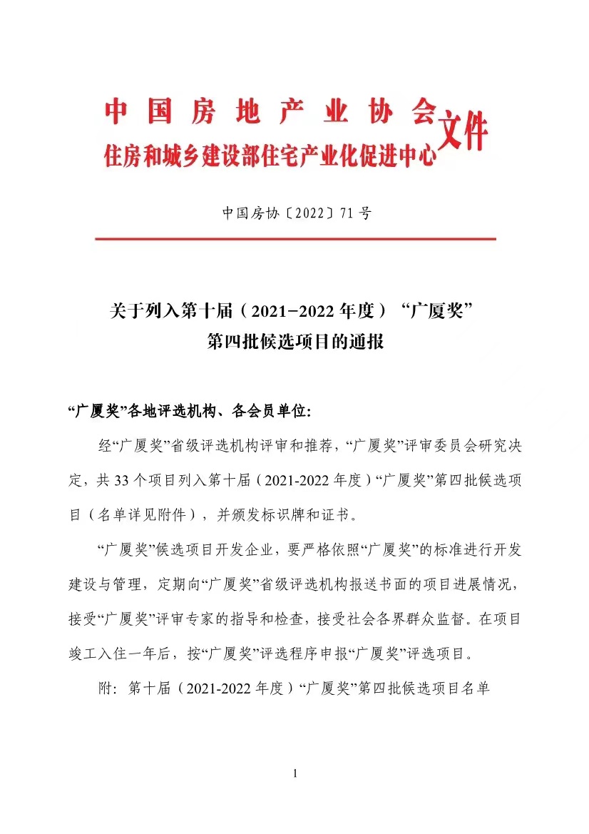 “廣廈獎(jiǎng)”是由住宅與城鄉(xiāng)建設(shè)部頒發(fā),經(jīng)國(guó)務(wù)院批準(zhǔn)設(shè)立的國(guó)家級(jí)房地產(chǎn)獎(jiǎng),也是國(guó)內(nèi)房地產(chǎn)建設(shè)領(lǐng)域最有影響力和權(quán)威性的獎(jiǎng)項(xiàng)之一,代表著中國(guó)房地產(chǎn)開發(fā)行業(yè)的最高榮譽(yù),由中國(guó)房地產(chǎn)業(yè)協(xié)會(huì)、住房和城鄉(xiāng)建設(shè)部住宅產(chǎn)業(yè)化促進(jìn)中心共同組織實(shí)施。獲獎(jiǎng)項(xiàng)目均為規(guī)劃設(shè)計(jì)水平高、環(huán)境質(zhì)量好、工程質(zhì)量?jī)?yōu)、人民群眾滿意的好房子,并在推進(jìn)住宅綠色、健康、產(chǎn)業(yè)化、“四節(jié)一環(huán)保”和解決廣大群眾住房問題方面起示范、帶動(dòng)作用的地產(chǎn)項(xiàng)目。